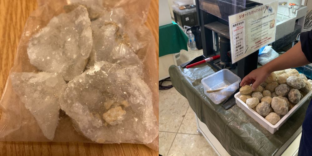 ながの東急百貨店の宝石展で行われた、ジオードと呼ばれる石を割る体験イベントの様子です。専用の器具を使って石を割ると、中から白く輝く石英の結晶が現れ、自然が作り出した美しい結晶構造を間近で見ることができました。