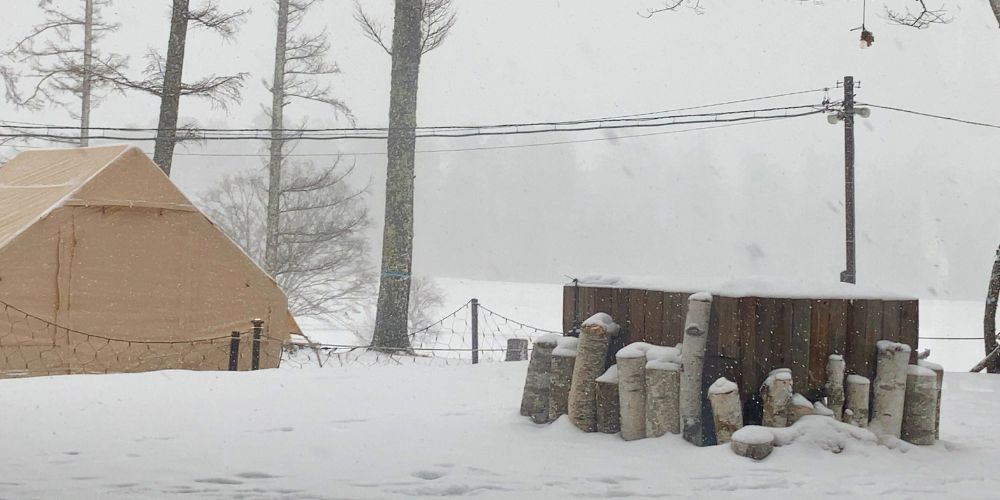 白く染まるテントと薪の山の向こうには、厳しい寒さの中でも冬キャンプを楽しむ人の姿がありました。