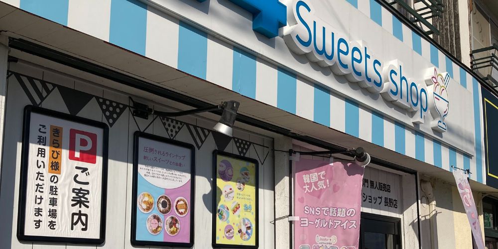 長野市上松にあるお菓子屋さんの外観です。青と白のストライプが目を引く可愛らしい店構えで、通りからも分かりやすい雰囲気になっています。